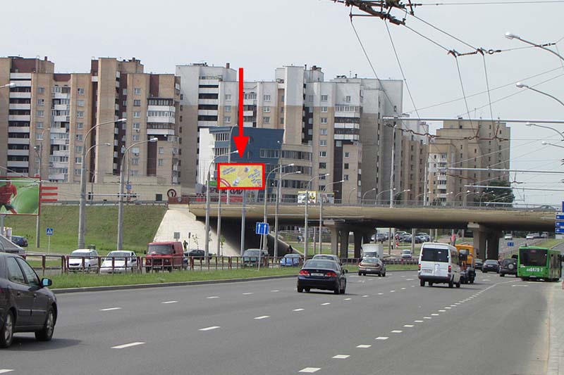 Конструкция находится на крупной транспортной развязке рядом с ТЦ Корона-Сити, в котором находится магазин Корона, детский развлекательный центр Базиллион, магазин бытовой техники 5 элемент, детские магазины Буслик, Mothercare, магазин «Columbia», спортивный магазин «Mysport». Также недалеко расположен магазин Санта. Направление движения в сторону ул. Аэродромная.