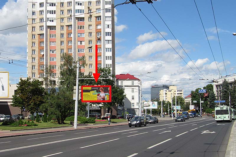 Конструкция охватывает транспортный поток, следующий к ул. Московская, находится возле гостиницы "Спутник". Рядом расположены Октябрьское отделение в г.Минске БПС-Банк, Дворец культуры и спорта железнодорожников, средняя школа №1, магазин Евроопт, несколько аптек, Администрация Октябрьского района, отделение № 527/289 "Беларусбанк".