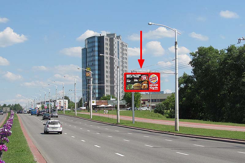 Интенсивный транспортный поток в направлении центра города. Рядом расположена АЗС "Юнайтед Компани". Впереди по ходу движения находится ТЦ ГЛОБО (супермаркет Рублевский, магазин Буслик, Мебель Black Red White), магазин строительных материалов Палас.
