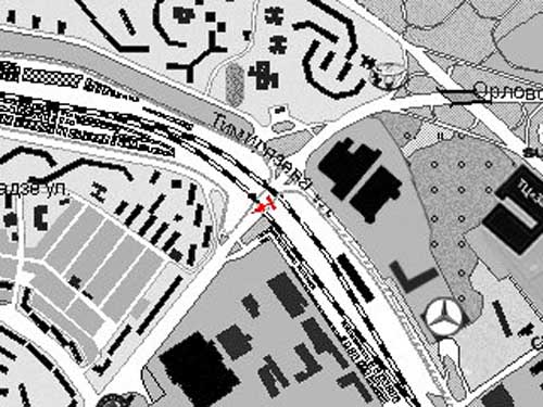Конструкция находится на развязке по улицам Орловской — Тимирязева, на подъезде к ул. Орловской, на съезде с ул. Тимирязева. Левее располагается Тойота центр Минск.