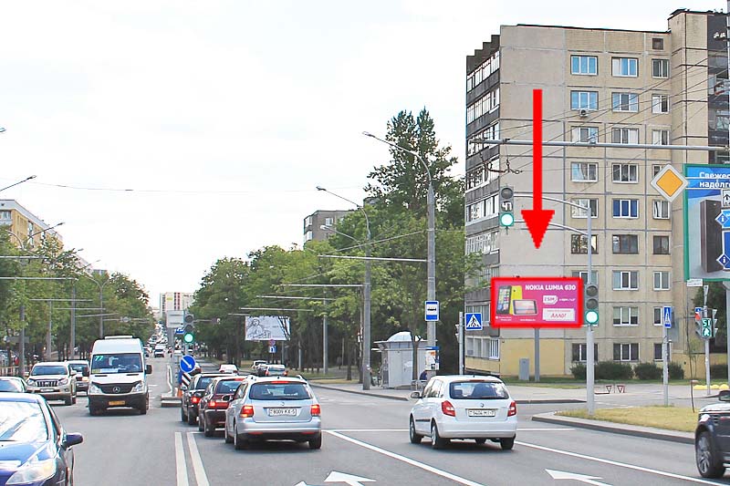 По направлению к ул. Кульман, ул. В. Хоружей, рынку Комаровский, за остановкой Ун-м Рига. Интенсивный транспортный и пешеходный поток (ул. Сурганова относится ко второму транспортному кольцу). Рядом находятся супермаркета "Preston", ТЦ "Рига", ф-л № 514 ОАО Беларусбанк, кафе, рестораны, бары, McDonald's, супермаркет для детей "Буслiк", БЦ "Европа", медицинский центр "Нордин", Аптека №1 ЗАО "Оффицина", Аптека №12 ООО "Фарммаркет-плюс".