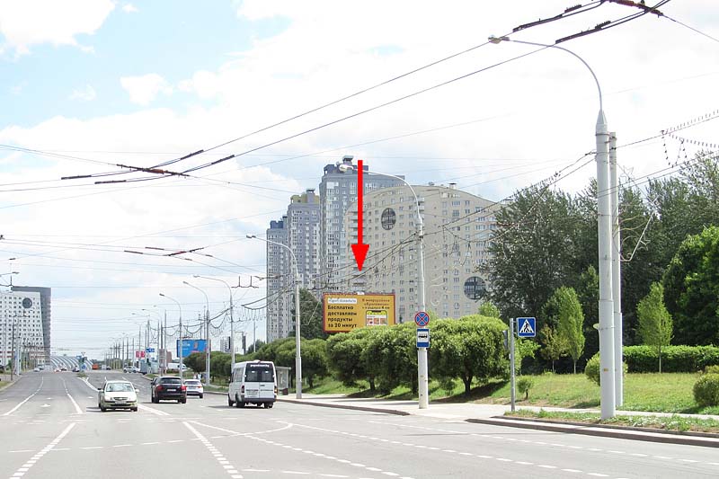 Оживленный транспортный поток в направлении пр.Дзержинского. Рядом находится ТЦ "Магнит" (магазин "Рублевский", LC WAIKIKI и др.), Парк им.Павлова — место проведения праздничных мероприятий и ярмарок. Впереди по ходу движения — студенческая деревня.
