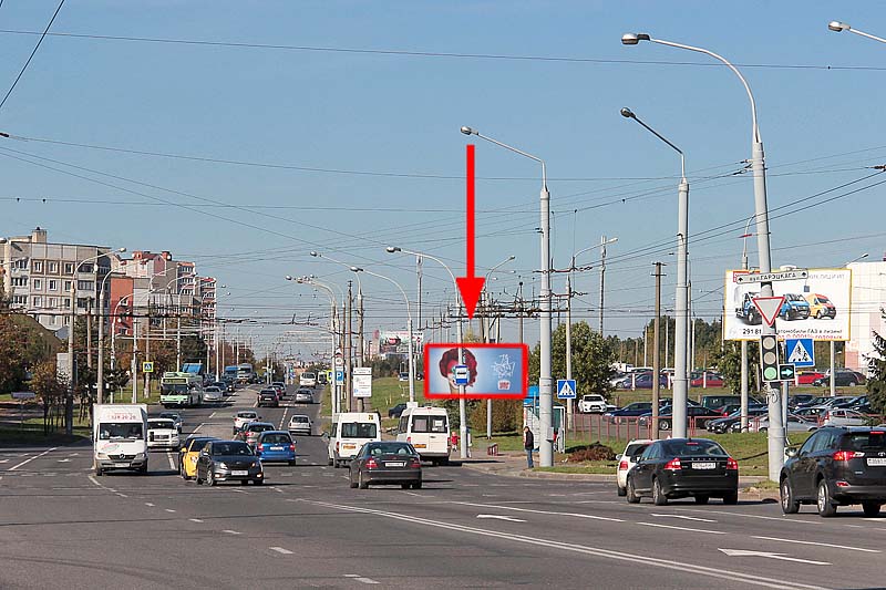 Конструкция расположена на одном из оживленных перекрестков микрорайона Сухарево. За остановкой общественного транспорта Ул.М. Горецкого. Рядом находится ТЦ Магнит (супермаркет Рублевский, магазин Спортмастер, LC Waikiki, Sister`s, Твое и др.; магазин косметики Мила, ювелирных изделий 7 Карат), автоцентр Атлант-М.