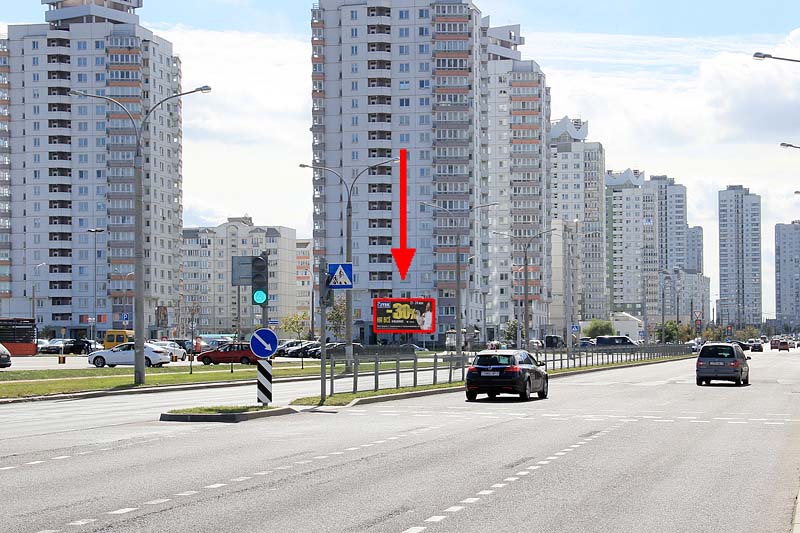 Конструкция расположена за остановкой общественного транспорта ул. Казимировская. Слева расположены ТЦ Евроопт, магазин Белита-Витекс, салон связи Velcom. По направлению движения пр. Притыцкого.