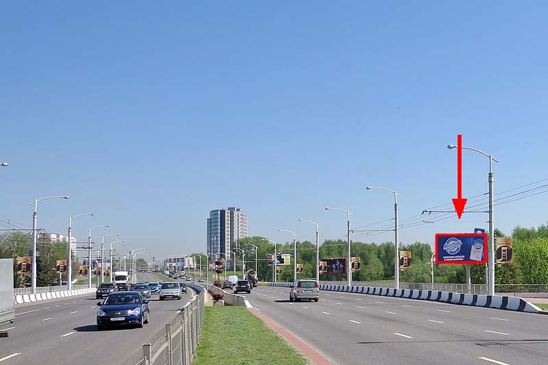 Конструкция находится на транспортной развязке Дзержинского пр. — Семашко ул. Интенсивный транспортный поток в направлении центра города. Рядом расположена АЗС "Юнайтед Компани". Впереди по ходу движения находится ТЦ "ГЛОБО" (супермаркет Рублевский, магизанн "Буслик", магазин "Электросила"), магазин строительных материалов "Палас".