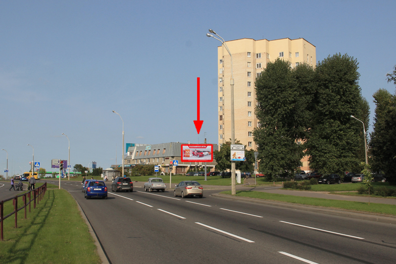 Рекламоноситель охватывает транспортный поток, следующий по направлению к строительному гипермаркету MILE и торговому центру ALL. Рядом АЗС Белоруснефть.