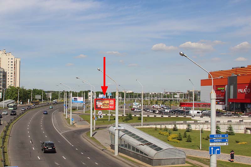 Рекламоноситель находится по направлению к Дворцу Независимости, парку Dreamland, выставочному комплексу БелЭкспо, ТЦ Замоку. Охватывает транспортный поток, следующий по направлению к пл. Бангалор.