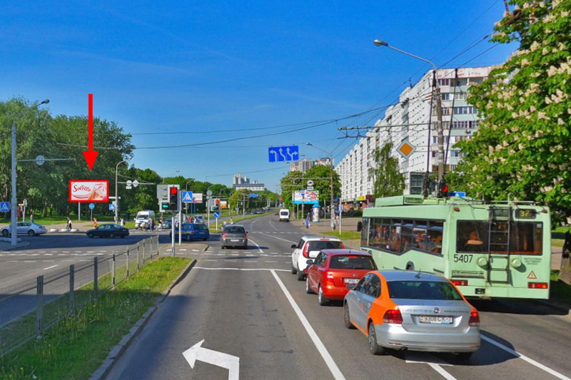 По направлению к пл. Бангалор, напротив аптеки № 8 "Планета Здоровья", возле парка "Дружбы народов". Интенсивный транспортный поток (ул. Богдановича является дублером ул. Я. Коласа и Логойского тракта). Рядом находятся средняя школа № 28, школа раннего интеллектуально-эстетического развития "Ступеньки детства", магазин бытовой техники, McDonald's, магазин "Радзивиловский", кафе, ф-л Беларусбанка, Аптека № 53.